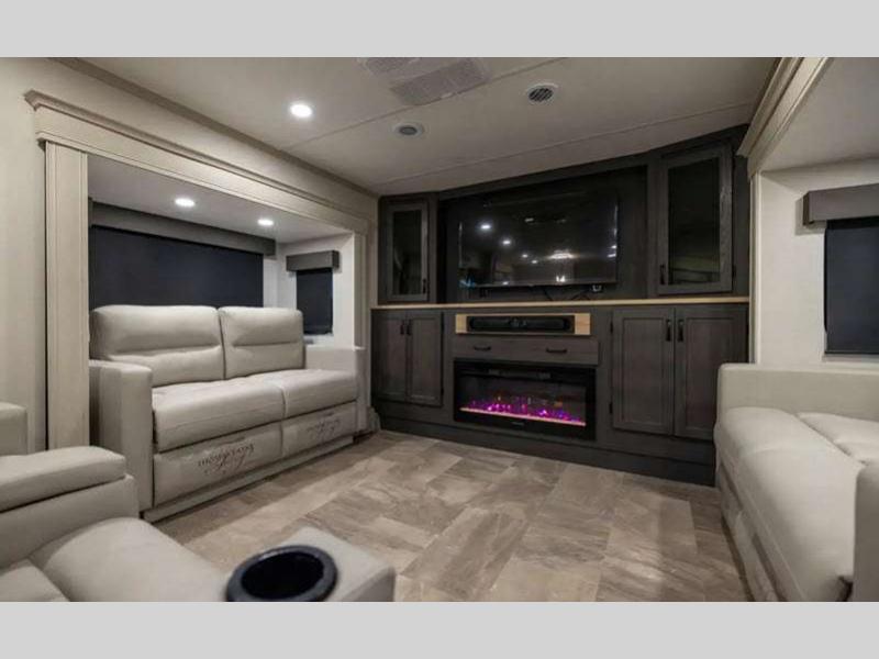 Sleeps 2 Slides 3 Length 42 ft 3 in Ext Width 8 ft 5 in Ext Height 13 ft 2 in Hitch Weight 2340 lbs GVWR 14500 lbs Dry Weight 13153 lbs Cargo Capacity 1347 lbs Fresh Water Capacity 60 gals Grey Water Capacity 85 gals Black Water Capacity 45 gals Furnace BTU 40000 btu Available Beds King Refrigerator Type 12V Refrigerator Size 16 cu ft Cooktop Burners 4 Shower Size 30" x 48" Number of Awnings 1 Water Heater Type On Demand AC BTU 27000 btu TV Info LR 50" 4K Smart LED TV Awning Info 17' Electric with LED Lights & Pitch Adjustment Axle Count 2 Washer/Dryer Available Yes Shower Type Shower w/Seat Electrical Service 50 amp Solar Wattage 200 watts Similar Floorplans