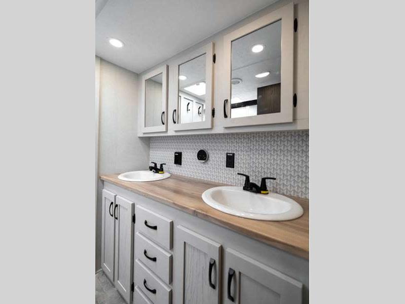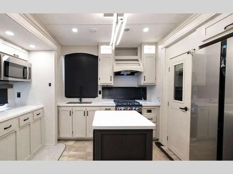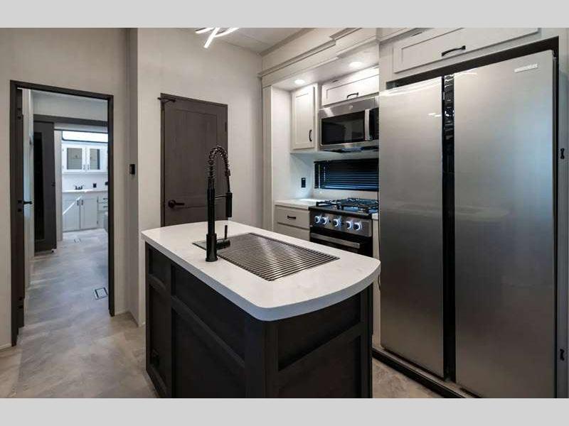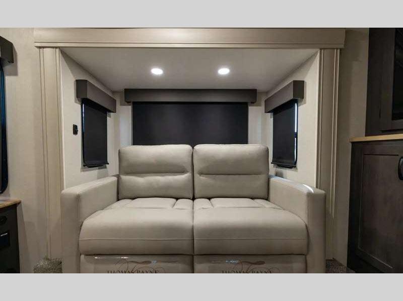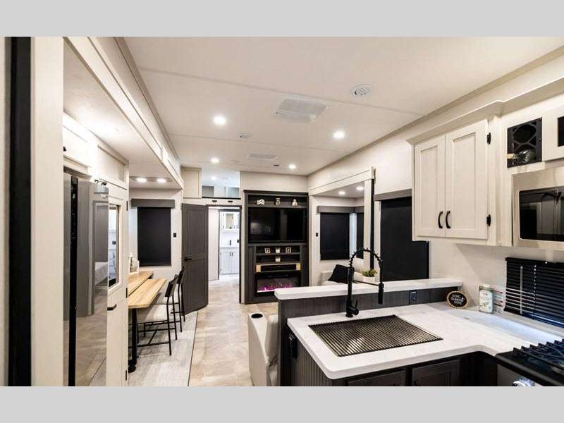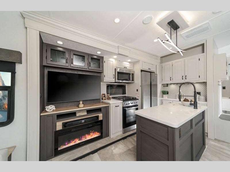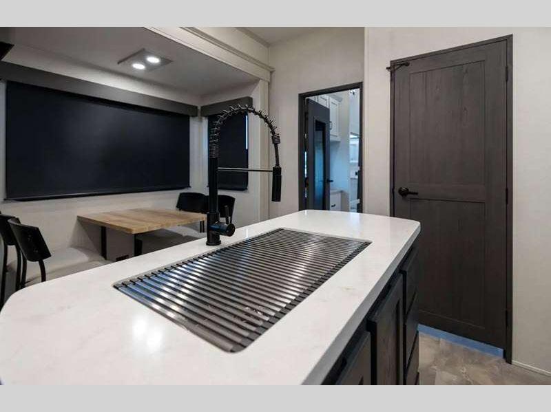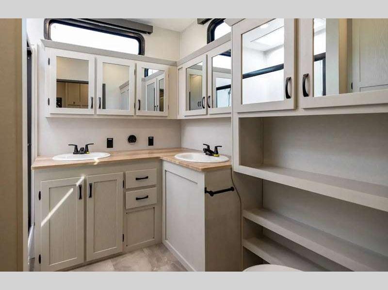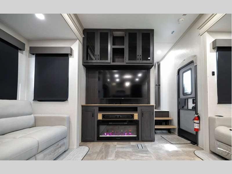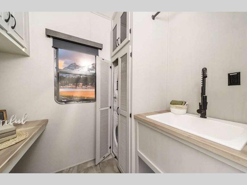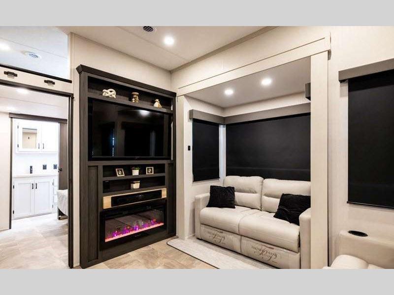The Tri-Tex powder coated frame technology is up to 5X more weather resistant, and the Road Guardian Package features self-adjusting brakes and anti-lock braking safety system that is also smart app friendly helping with shorter and more stable stopping distance. Each model includes a gear driven 6-point electric auto-leveling system, so you spend less time setting up and more time relaxing. You'll be pleasantly surprised to find at-home amenities throughout these fifth wheels, including solid surface countertops in the kitchen, slow rise roller night shades, a full-size shower with sliding glass doors, and so much more!
