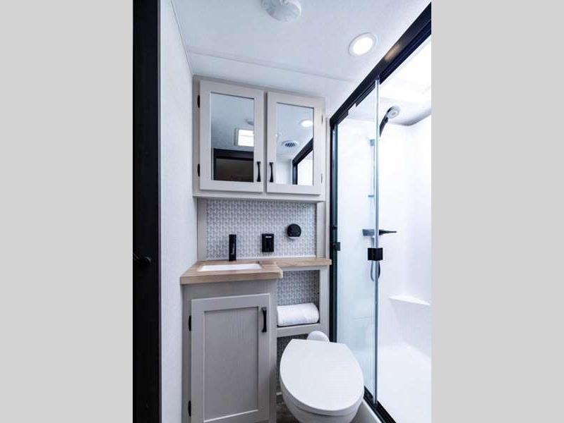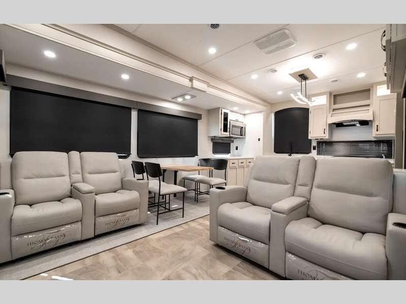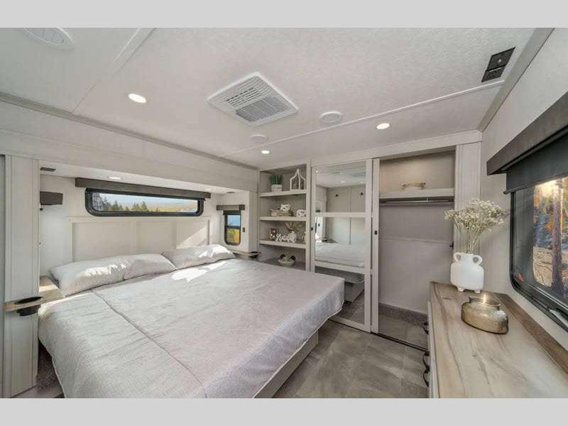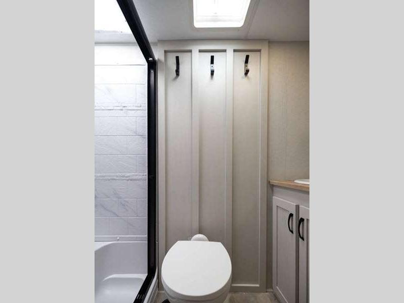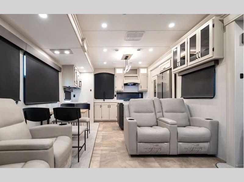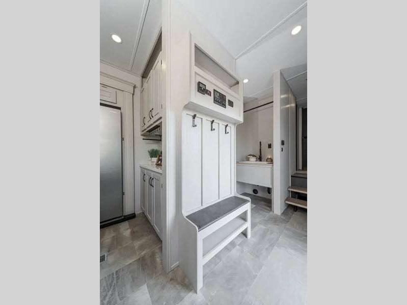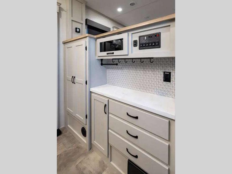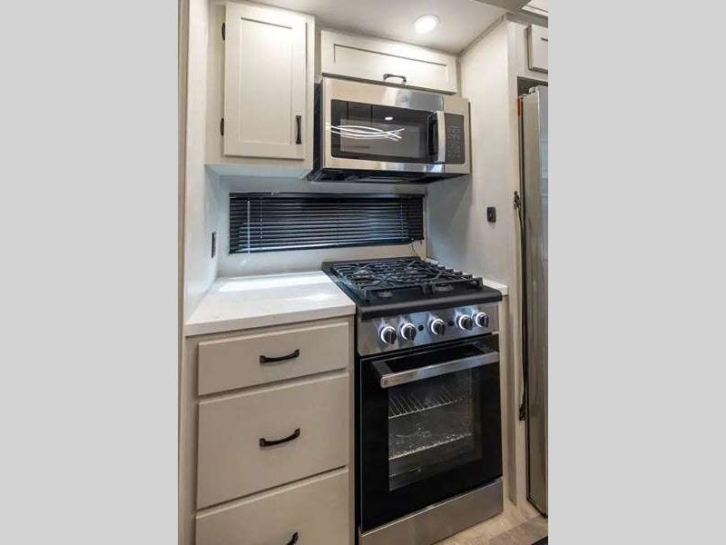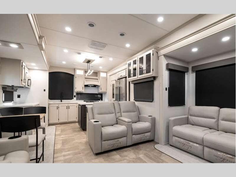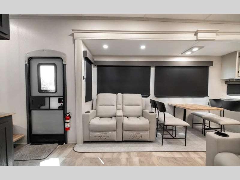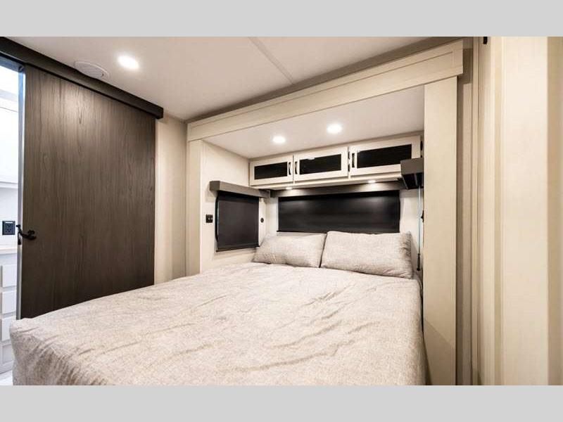 The Tri-Tex powder coated frame technology is up to 5X more weather resistant, and the Road Guardian Package features self-adjusting brakes and anti-lock braking safety system that is also smart app friendly helping with shorter and more stable stopping distance. Each model includes a gear driven 6-point electric auto-leveling system, so you spend less time setting up and more time relaxing. You'll be pleasantly surprised to find at-home amenities throughout these fifth wheels, including solid surface countertops in the kitchen, slow rise roller night shades, a full-size shower with sliding glass doors, and so much more!