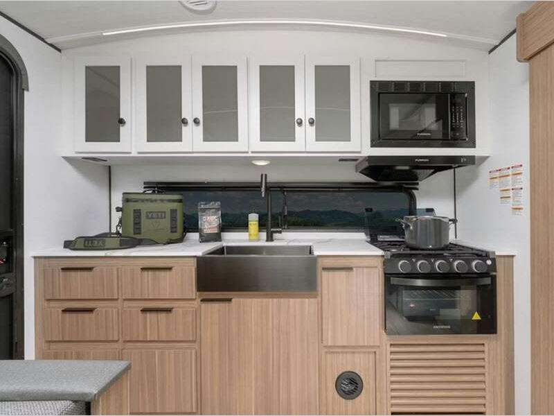 Sleeps 3 Slides 2 Length 31 ft 6 in Ext Height 11 ft 3 in Interior Color Cedar Frost Hitch Weight 895 lbs Dry Weight 7540 lbs Cargo Capacity 1960 lbs Fresh Water Capacity 54 gals Grey Water Capacity 76 gals Black Water Capacity 38 gals Tire Size ST225/75R15E Available Beds King Refrigerator Type 12V Refrigerator Size 10 cu ft Cooktop Burners 3 Number of Awnings 1 LP Tank Capacity 20 lbs TV Info Smart TV Awning Info Power Awning w/LED Light Strip Axle Count 2 Number of LP Tanks 2 Shower Type Standard Electrical Service 50 amp Similar Floorplans